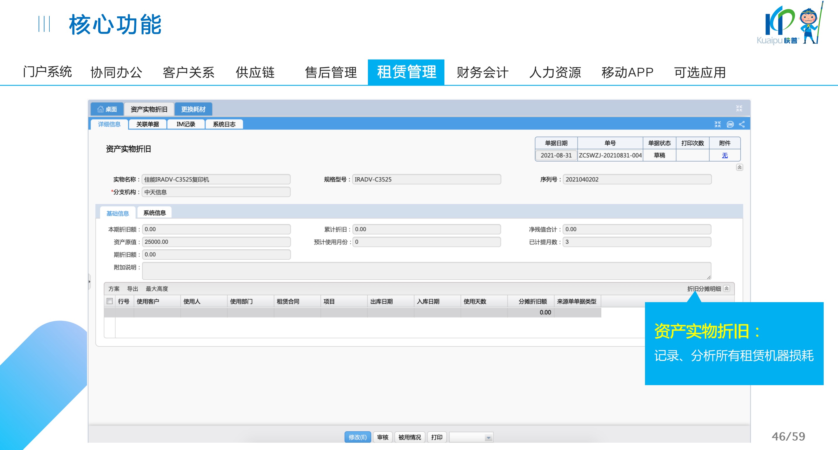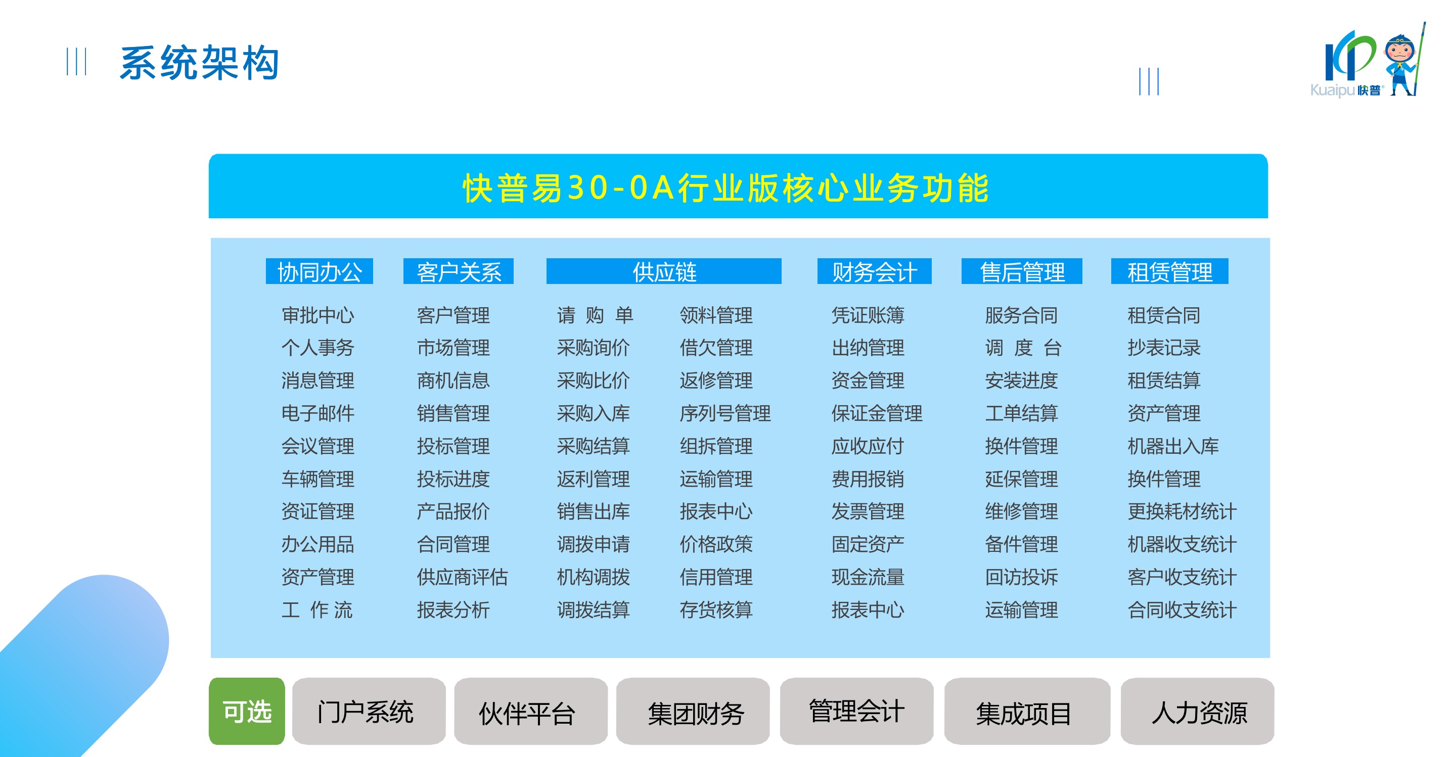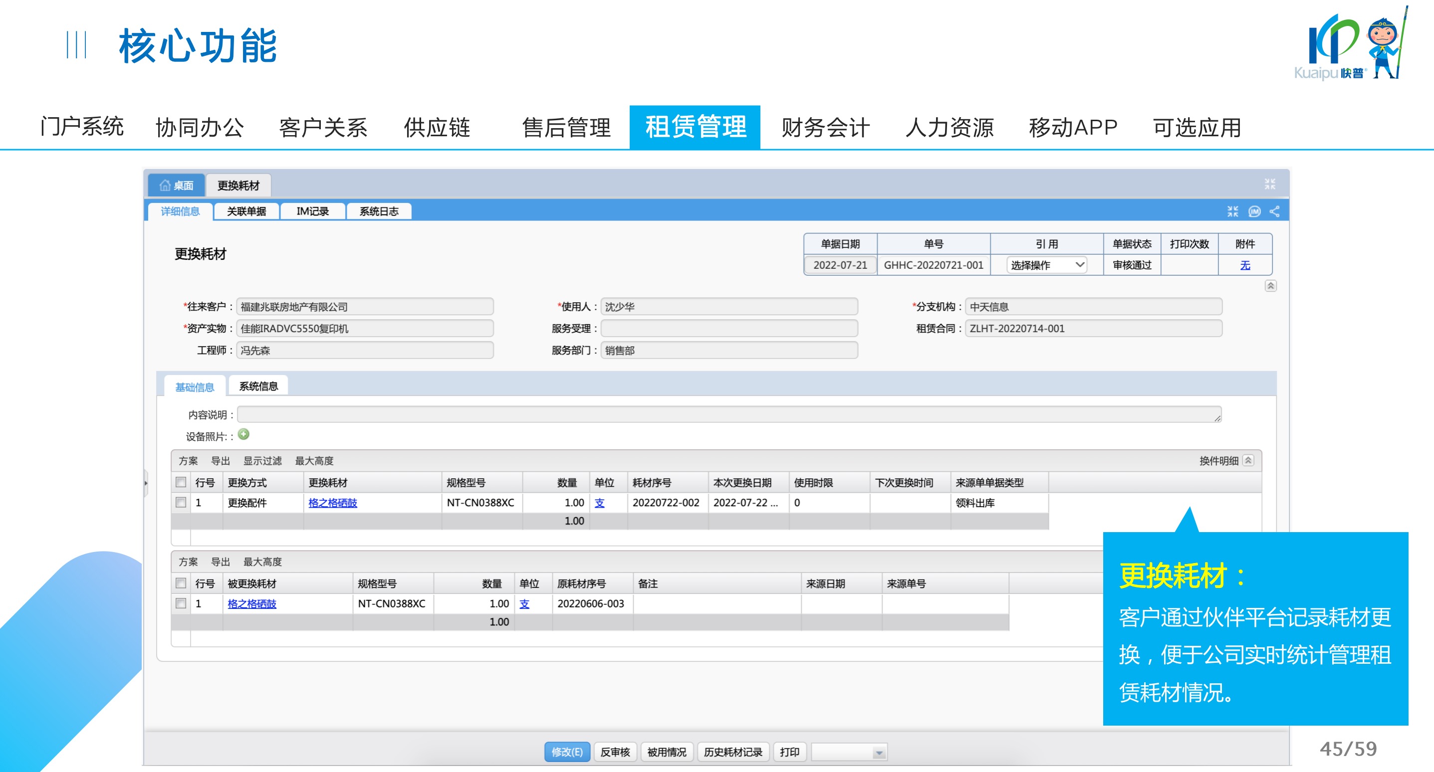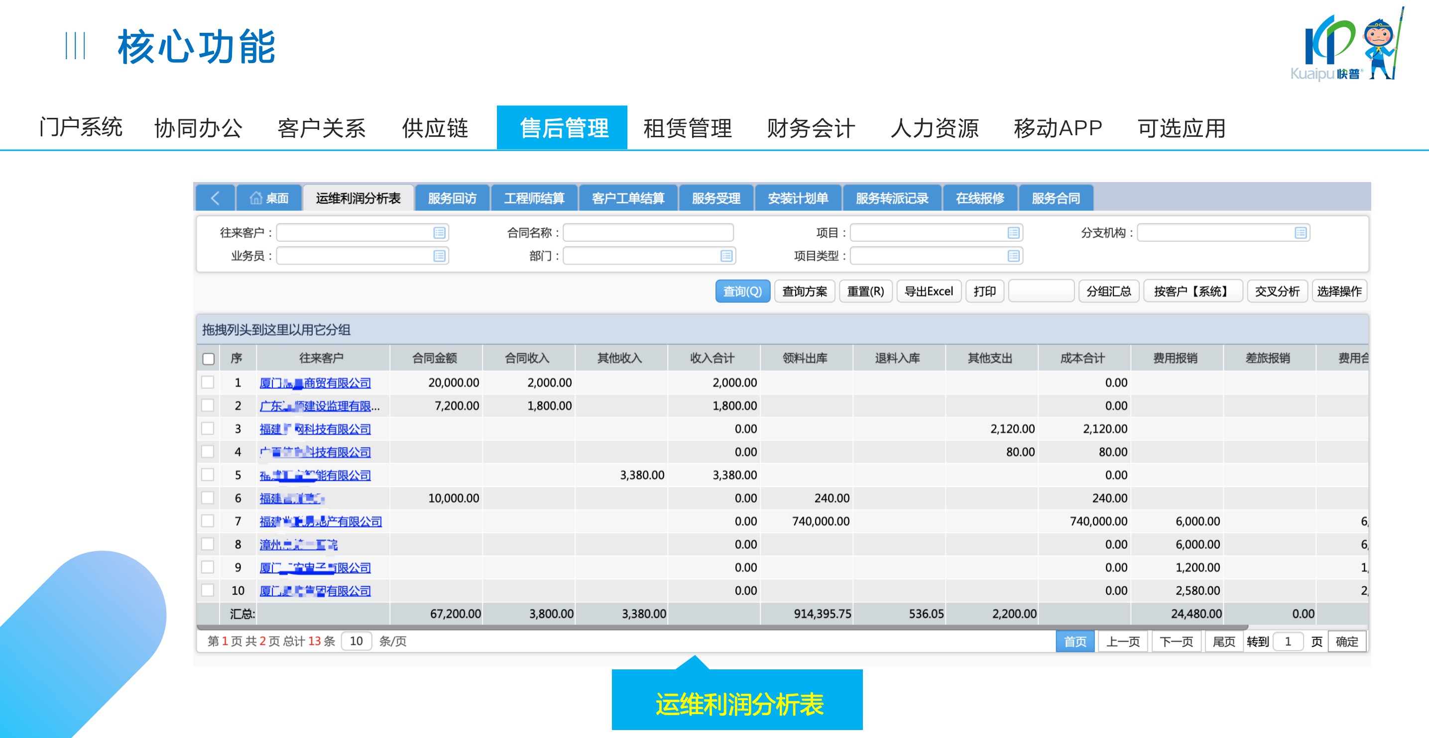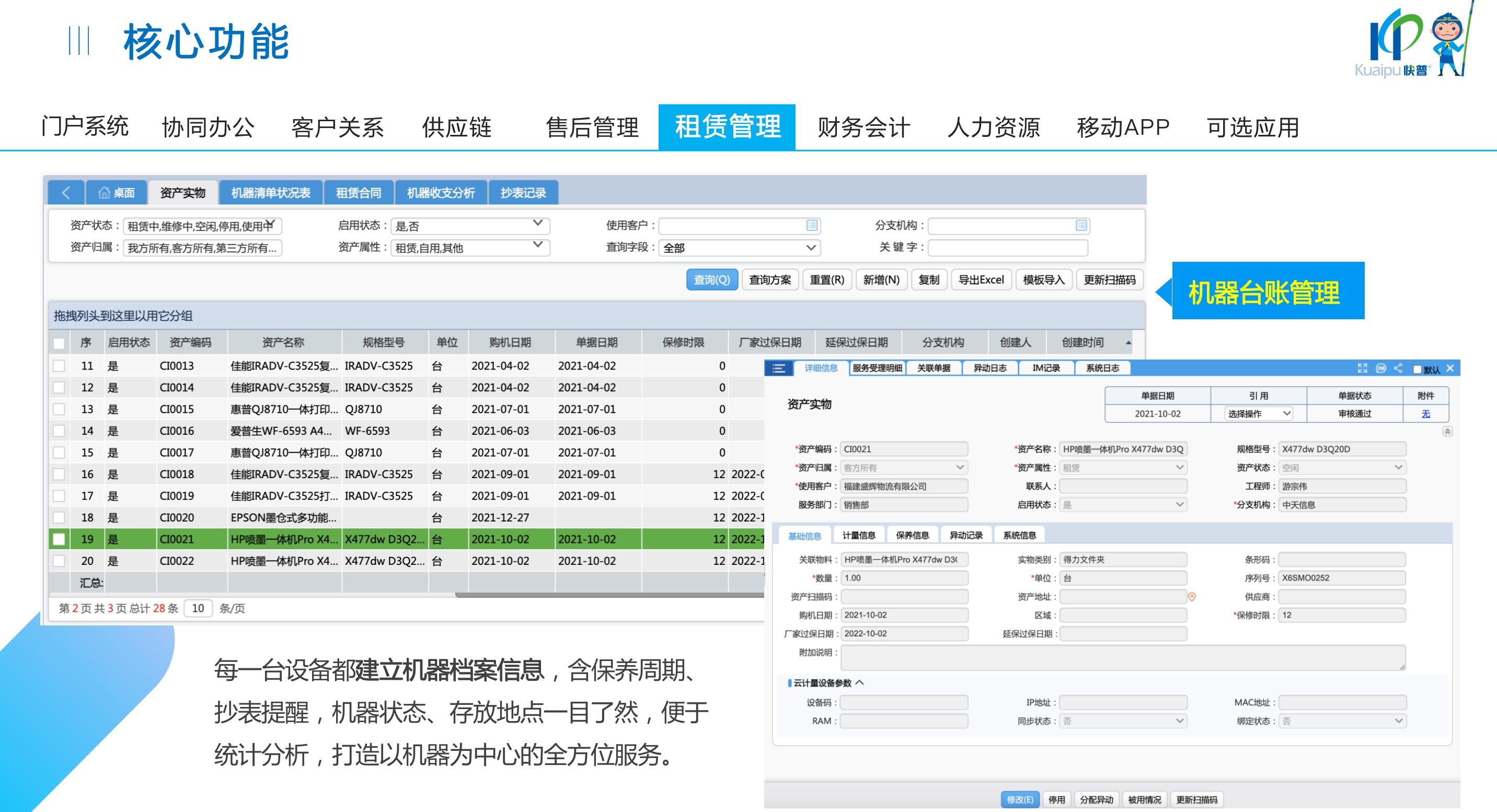 快普易30基于快普近20年在全國(guó)上萬(wàn)家OA企業(yè)的實(shí)施與服務(wù)經(jīng)驗(yàn),融合了行業(yè)成功的管理智慧,以“客戶(hù)+機(jī)器”為中心提供數(shù)字化轉(zhuǎn)型解決方案,全面解決銷(xiāo)售、服務(wù)、租賃等多種業(yè)務(wù)模式的管理需求,以及企業(yè)經(jīng)營(yíng)核算分析。