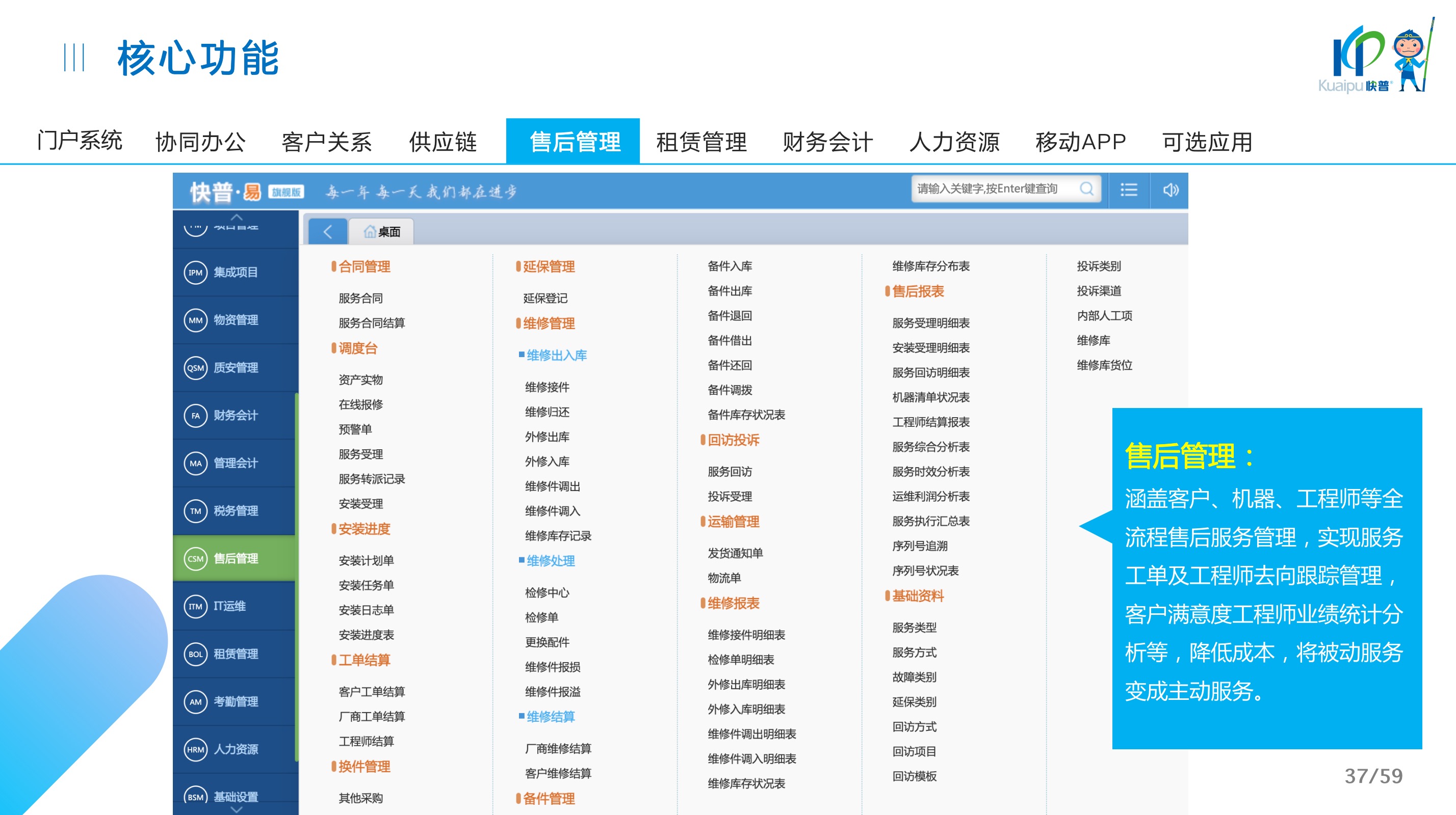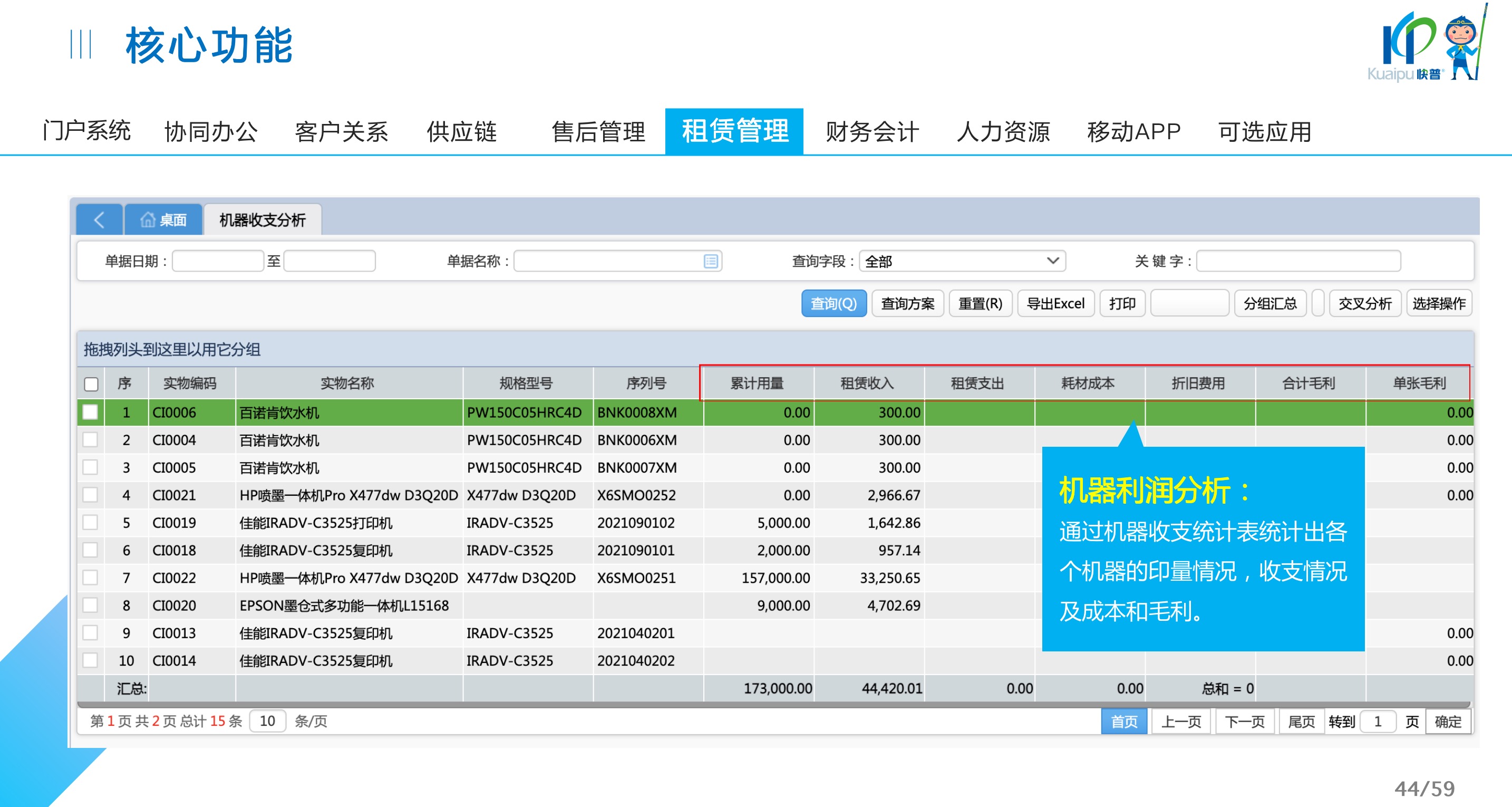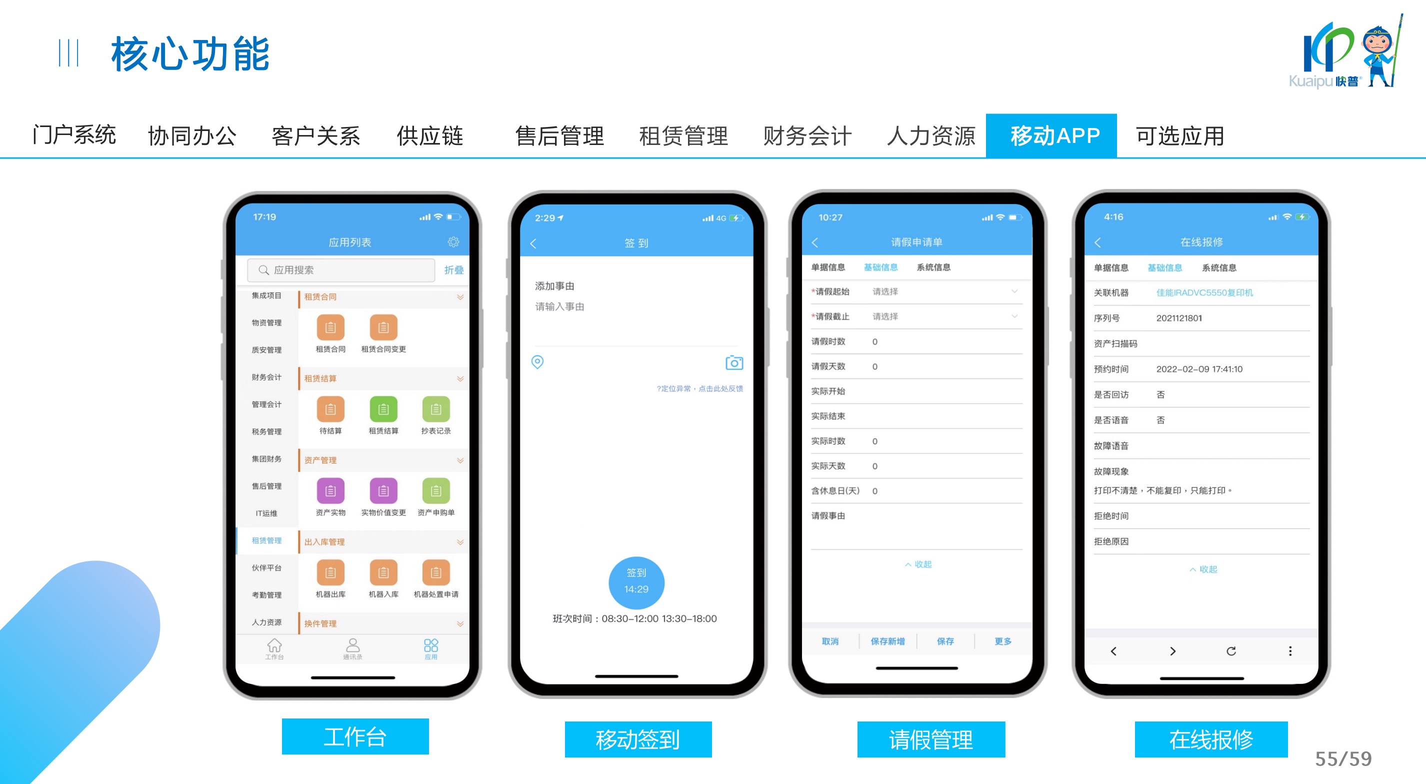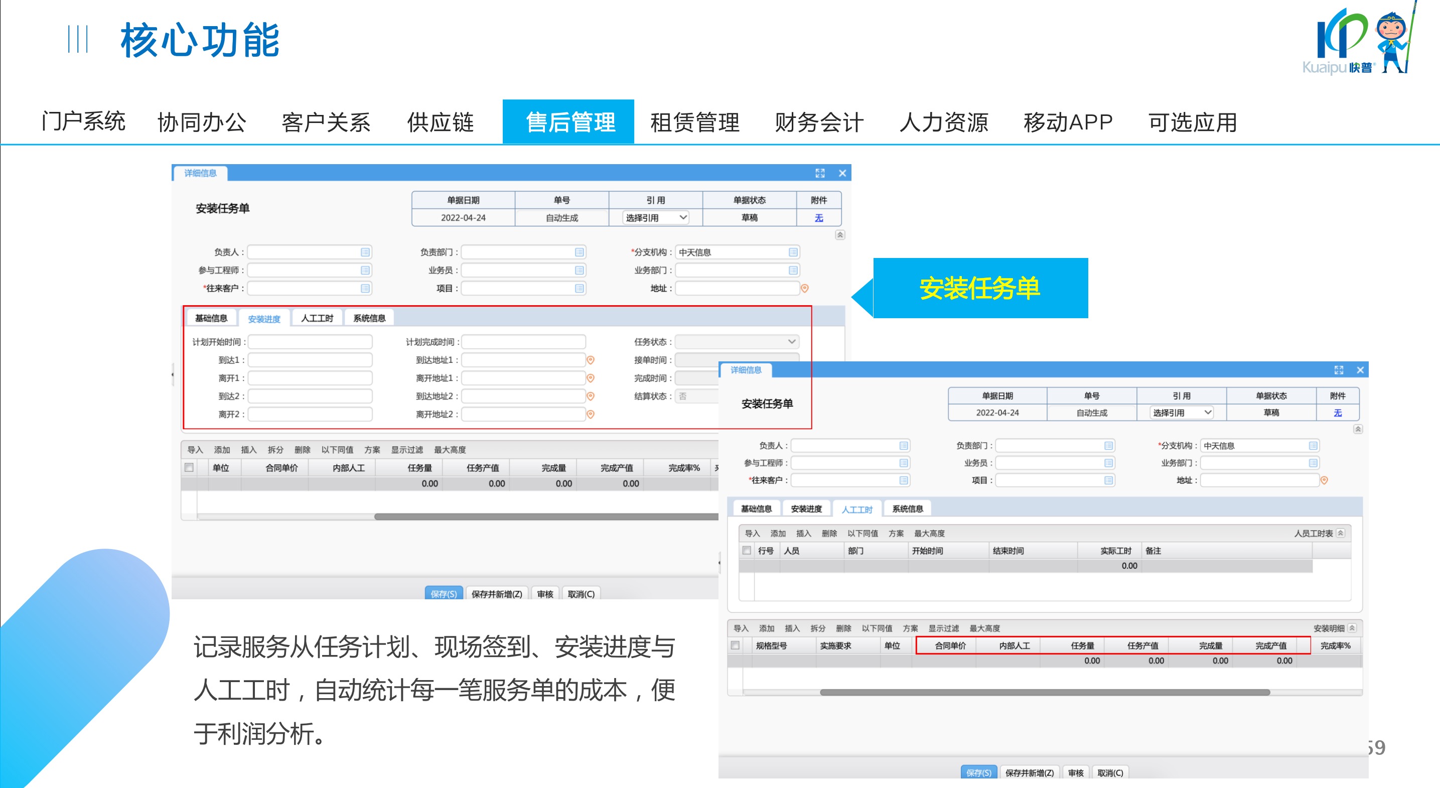 快普易30基于快普近20年在全國(guó)上萬(wàn)家OA企業(yè)的實(shí)施與服務(wù)經(jīng)驗(yàn),融合了行業(yè)成功的管理智慧,以“客戶(hù)+機(jī)器”為中心提供數(shù)字化轉(zhuǎn)型解決方案,全面解決銷(xiāo)售、服務(wù)、租賃等多種業(yè)務(wù)模式的管理需求,以及企業(yè)經(jīng)營(yíng)核算分析。