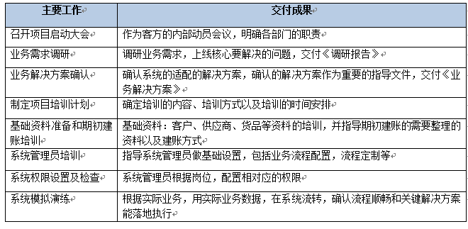 該階段主要是做實(shí)施基礎(chǔ)的搭建,包括完成內(nèi)部交接、確認(rèn)雙方的項(xiàng)目組成員名單、確認(rèn)實(shí)施范圍、確認(rèn)實(shí)施計(jì)劃、服務(wù)器準(zhǔn)備以及軟件部署。該階段結(jié)束以《項(xiàng)目啟動階段里程碑確認(rèn)單》作為交付。