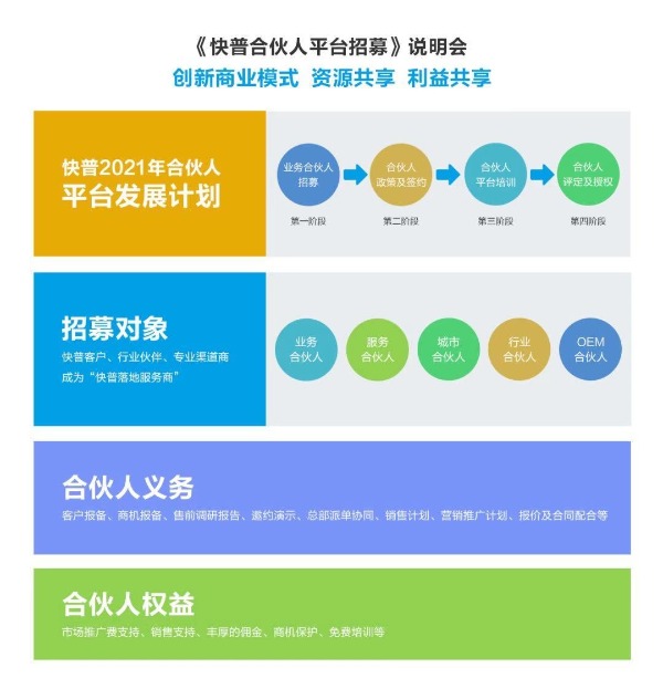 快普合伙人平臺將依托快普整合管理、專注細分行業(yè)與強大的技術平臺支持三大優(yōu)勢,面向各行各業(yè)招募合伙人,通過多種合作形式,建立“快普落地服務商”,幫助全國更多企業(yè)實現(xiàn)信息化轉(zhuǎn)型,提高企業(yè)的技術創(chuàng)新能力與品牌價值。