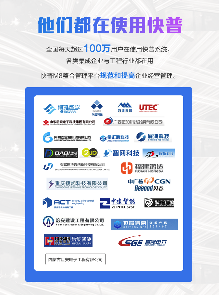 依托快普M8整合管理平臺,為三足路橋打造一個從項目計劃、預算、材料采購、施工現場管理、勞務外包、進度管理、內業(yè)管理等全生命周期的項目管理,實現企業(yè)內部整合管理,提高工作效率、降低手工填報錯誤的風險。同時,快普M8提供多維度的成本分析、利潤核算等一系列管理報表,為三足路橋實時分析每個項目的盈虧狀況,以實現風險控制和科學決策,提高項目核心競爭力。