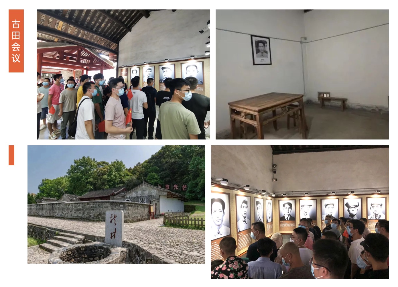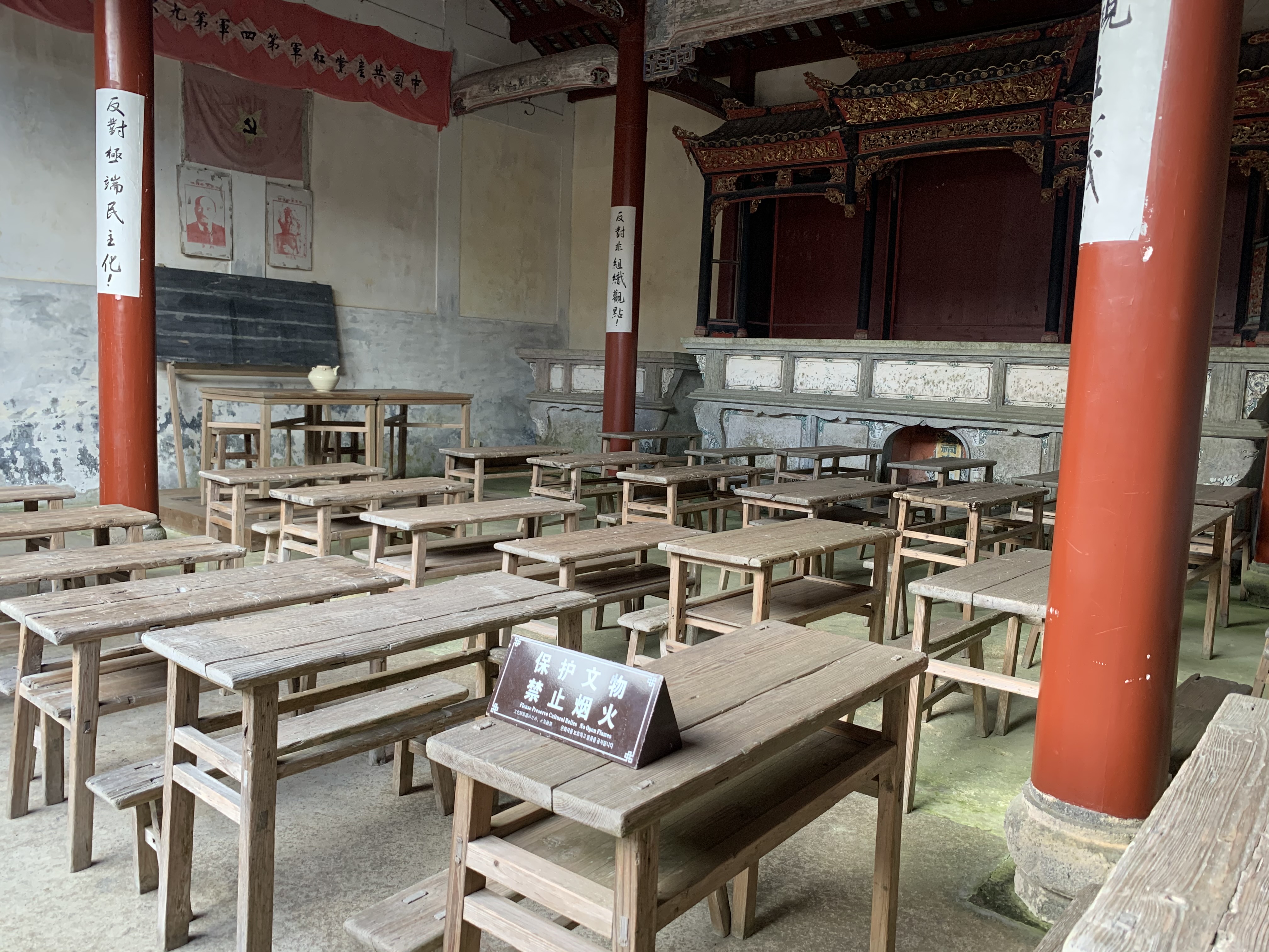 會址保持了當(dāng)年的陳設(shè),6列學(xué)生桌椅陳舊而整潔。會場正上方掛著“中國共產(chǎn)黨紅軍第九次代表大會”的橫幅,地板上的斑斑炭火印跡,瞬間把我們帶到了1929年那次非同尋常的會議。