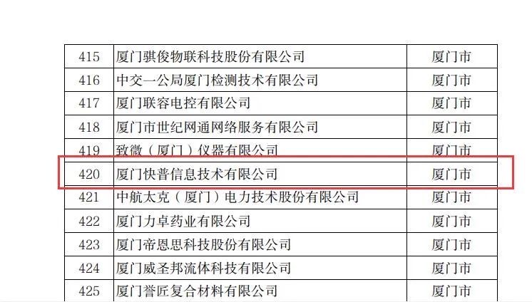 近日,福建省科學(xué)技術(shù)廳網(wǎng)站公示了“2022年福建省科技小巨人企業(yè)”名單,廈門快普信息技術(shù)有限公司以突出的自主創(chuàng)新能力、優(yōu)秀的技術(shù)研發(fā)成果、良好的業(yè)績和市場占有率,從全省遴選企業(yè)中脫穎而出,成功入選!
