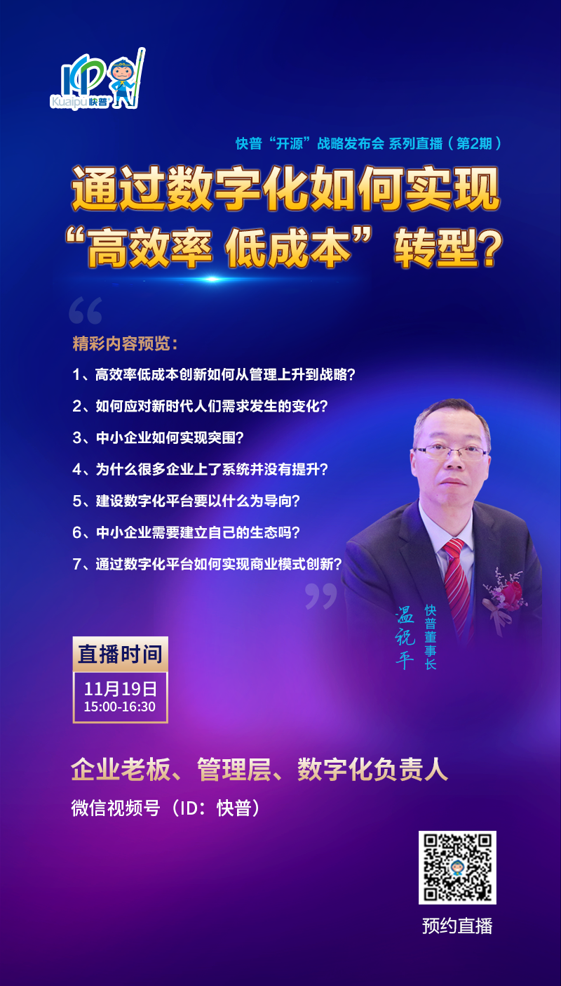 為幫助新老客戶共渡難關(guān),共同面對(duì)疫情反復(fù)、俄烏戰(zhàn)爭持久化及中美沖突加劇帶來的各種風(fēng)險(xiǎn)和挑戰(zhàn),幫助中國企業(yè)低成本、高效率進(jìn)行數(shù)字化轉(zhuǎn)型, 快普已正式啟動(dòng)ERP“開源”戰(zhàn)略!發(fā)布會(huì)(系列)直播從10月起通過“快普”視頻號(hào)陸續(xù)播出,與您分享近三年快普最新研發(fā)成果及數(shù)字化轉(zhuǎn)型解決方案,歡迎新老客戶預(yù)約收看,相信能為您的企業(yè)轉(zhuǎn)型帶來新的啟發(fā)。