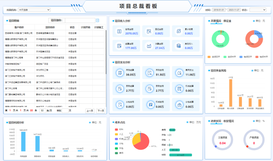 其中,備受關(guān)注的項目利潤智能分析,也通過快普易60輕松實現(xiàn)了。基于項目過程的數(shù)據(jù)沉淀,管理層通過快普門戶的項目看板即可實時查看項目進度、收入、支出、成本、利潤、風(fēng)險管控等各種數(shù)據(jù),方便及時進行指導(dǎo)和干預(yù)。