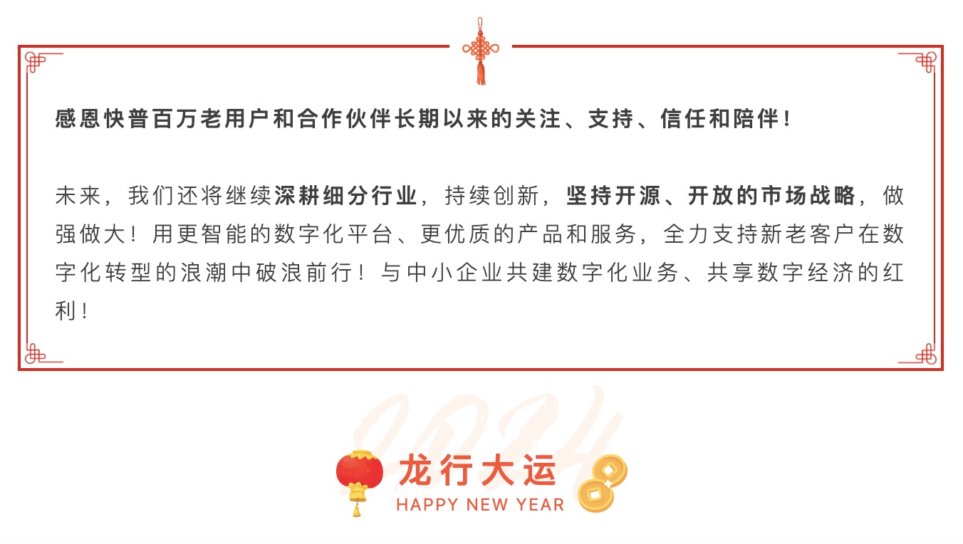 2023年是快普銳意改革、開拓進(jìn)取的一年。面對(duì)機(jī)遇和挑戰(zhàn),我們苦練內(nèi)功,加大研發(fā)投入,積極擁抱市場(chǎng),通過新一代“易”系列產(chǎn)品,幫助大量企業(yè)成功實(shí)現(xiàn)數(shù)字化的轉(zhuǎn)型升級(jí),賦能企業(yè)邁向高質(zhì)量發(fā)展!同時(shí),快普也實(shí)現(xiàn)了自身的逆勢(shì)增長(zhǎng),多項(xiàng)科技創(chuàng)新成果獲得了政府的嘉獎(jiǎng)與社會(huì)各界的好評(píng)!2024年,我們不忘初心,堅(jiān)守“數(shù)字化平臺(tái)服務(wù)商”的使命,1月份再創(chuàng)多項(xiàng)佳績(jī)!