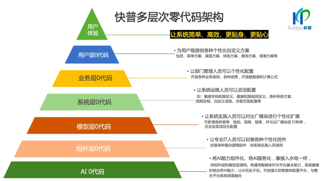針對這一核心問題,溫董詳細(xì)闡釋了快普獨(dú)創(chuàng)的 “多層次零代碼架構(gòu)” 如何助力企業(yè)實(shí)現(xiàn)“小快輕準(zhǔn)”轉(zhuǎn)型: