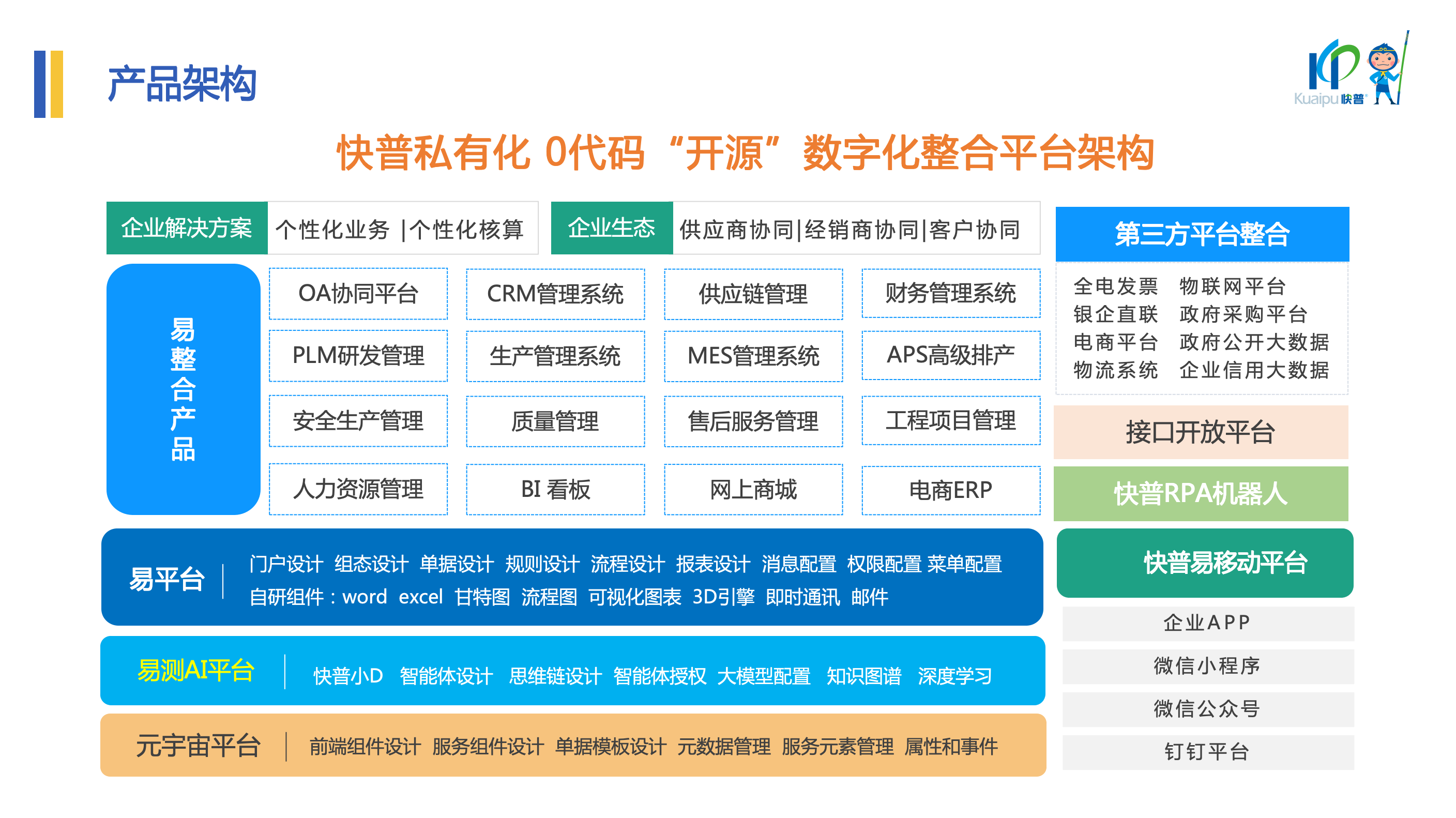 針對(duì)企業(yè)普遍面臨的“信息孤島”難題——系統(tǒng)林立、數(shù)據(jù)不通、業(yè)務(wù)流程斷點(diǎn)卡點(diǎn)眾多,導(dǎo)致內(nèi)部協(xié)同低效、管理成本高昂等問(wèn)題,溫董指出:“系統(tǒng)整合是提質(zhì)增效最有效的手段,碎片化的系統(tǒng)建設(shè)模式已成為制約企業(yè)全局效率的罪魁禍?zhǔn)??!?br> 快普以“整合管理”為核心的數(shù)字化轉(zhuǎn)型理念,通過(guò)“一個(gè)平臺(tái)”覆蓋企業(yè)全鏈條管理,包括PLM研發(fā)管理、APS高級(jí)排產(chǎn)、MES車(chē)間執(zhí)行、供應(yīng)鏈協(xié)同、集團(tuán)化財(cái)務(wù)核算等。
