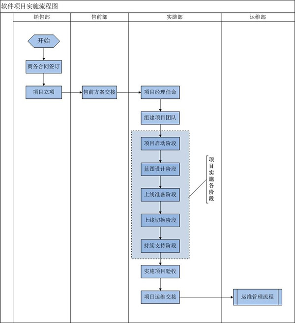 快普軟件項(xiàng)目實(shí)施分為五個(gè)階段:項(xiàng)目啟動(dòng)階段、藍(lán)圖設(shè)計(jì)階段、上線準(zhǔn)備階段、上線切換階段、持續(xù)支持階段。每個(gè)階段都有對(duì)應(yīng)的階段交付成果。完成這五個(gè)階段的任務(wù)之后,進(jìn)入實(shí)施項(xiàng)目驗(yàn)收階段。實(shí)施驗(yàn)收完成之后,轉(zhuǎn)入運(yùn)維部門(mén),實(shí)施過(guò)程結(jié)束。